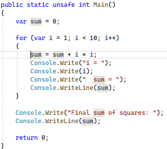 The following Blazar source code calculates the sum of squares from 1 to 9 and outputs the intermediate and final results to the console.